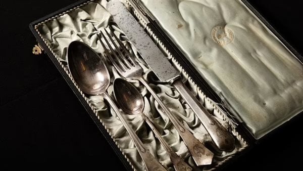 ويتضمن الطقم النادر من السكين الفضي والشوكة وملعقة التقديم وملعقة صغيرة، كل منها منقوش ب “A.H”.