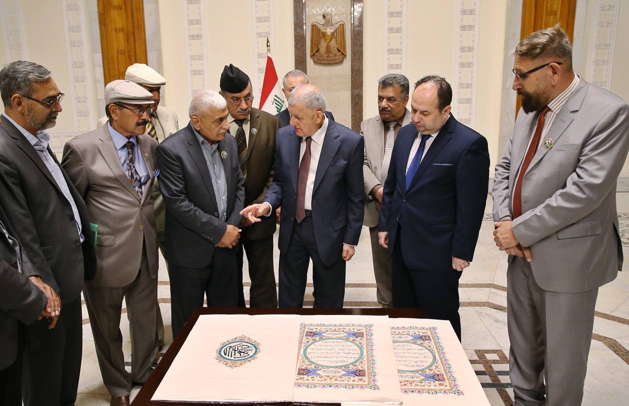 وأطلع رئيس الجمهورية على نتاج التجمع بكتابة القرآن الكريم الذي ساهم به (30) خطاطاً من مختلف المحافظات العراقية رداً على محاولات التطاول على المصحف الشريف، مثمناً هذا العمل المبارك. فيما قدّم رئيس التجمع إلى رئيس الجمهورية لوحة تمثل أحد فنون الخط العربي.
